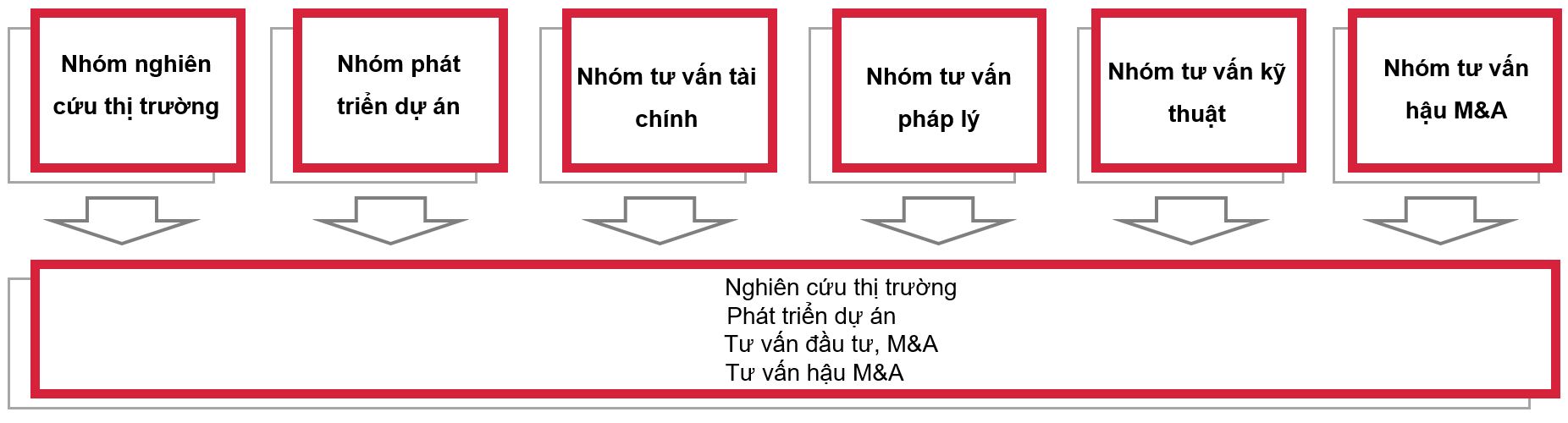 Các thành viên trong đội ngũ của chúng tôi đến từ các nền tảng chuyên môn khác nhau bao gồm công nghệ kỹ thuật,tiếp thị, tài chính, luật, ngân hàng và đầu tư, có kinh nghiệm làm việc trong các doanh nghiệp quốc tế và trong nước, trong lĩnh vực đầu tư, pháp lý, tài chính, quản trị doanh nghiệp và ngân hàng.Chúng tôi kết hợp giữa sự hiểu biết về địa phương sâu sắc với kiến thức chuyên môn quốc tế để cung cấp cho Khách hàng trong nước và quốc tế các dịch vụ có chất lượng trong nhiều lĩnh vực bao gồm nghiên cứu thị trường, phát triển dự án, đầu tư, M&A, hậu M&A, gọi vốn và tư vấn sắp xếp các khoản vay nước ngoài